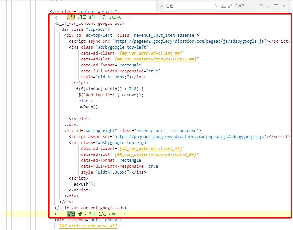 - <div class="content-article"> ~ <div itemprop="articleBody"> 사이에 상단광고 2개를 출력하는 HTML 코드가 있습니다.