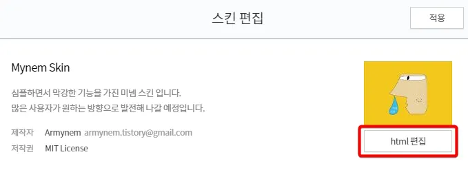 - 이 버튼을 눌러주시면 현재 티스토리 블로그에 적용되어 있는 스킨을 편집할 수 있는 모드로 진입할 수 있으며,