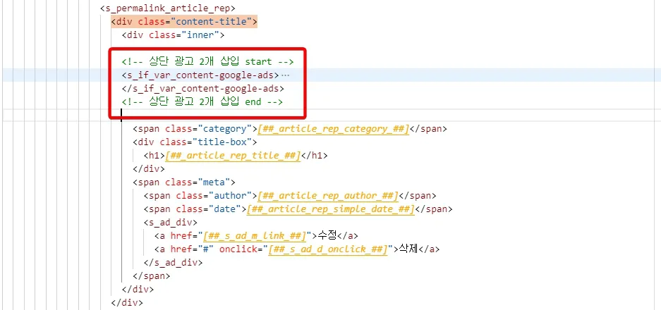 아래에서 설명하는 내용이 복잡하고 어렵게 보일 수 있지만 HTML 편집에서 상단광고에 해당하는 코드만 찾아서 제목을 출력하는 코드 위로 이동시키는 매우 간단한 작업입니다.