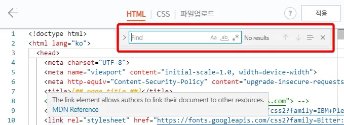 - HTML 코드가 적혀 있는 창을 한번 클릭한 다음 [컨트롤+F]을 눌러주면 아래의 화면처럼 HTML 코드를 검색할 수 있습니다.
