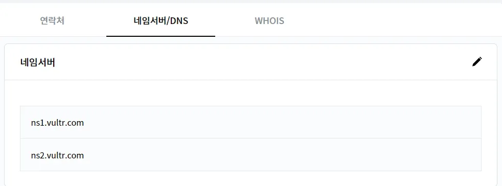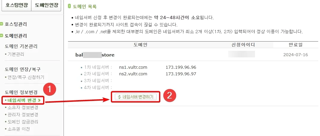 카페24, 호스팅kr에서 구입한 도메인을 벌쳐(vultr)의 네임서버1(ns1.vultr.com), 네임서버2(ns2.vultr.com)로 변경했습니다.