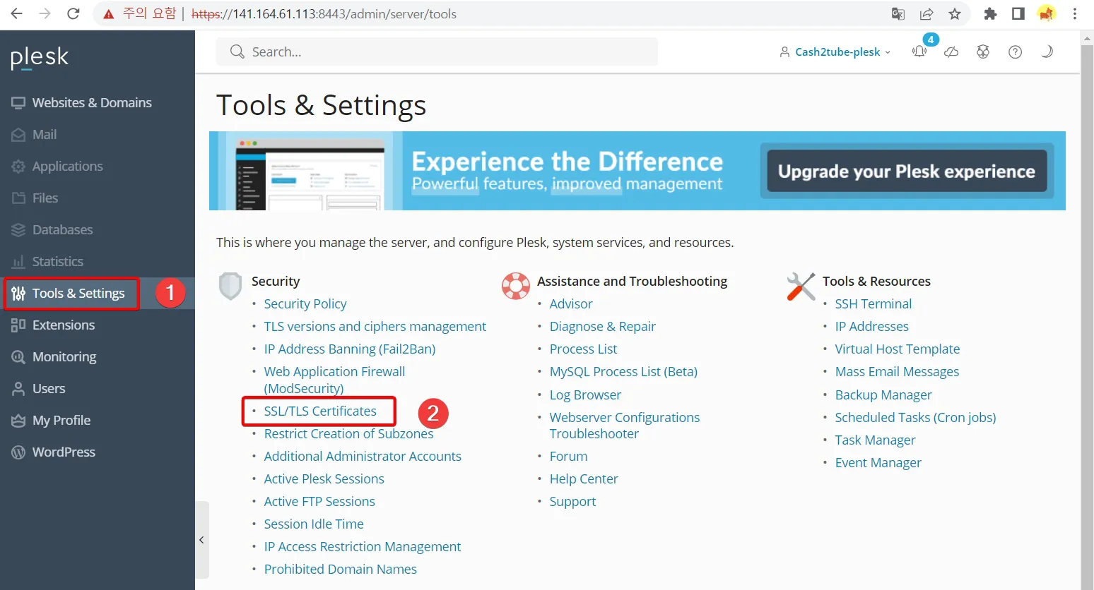 - Tools & Settings를 선택하고 페이지가 변경되면 Security 메뉴에 있는 SSL/TLS Certificates를 선택합니다.