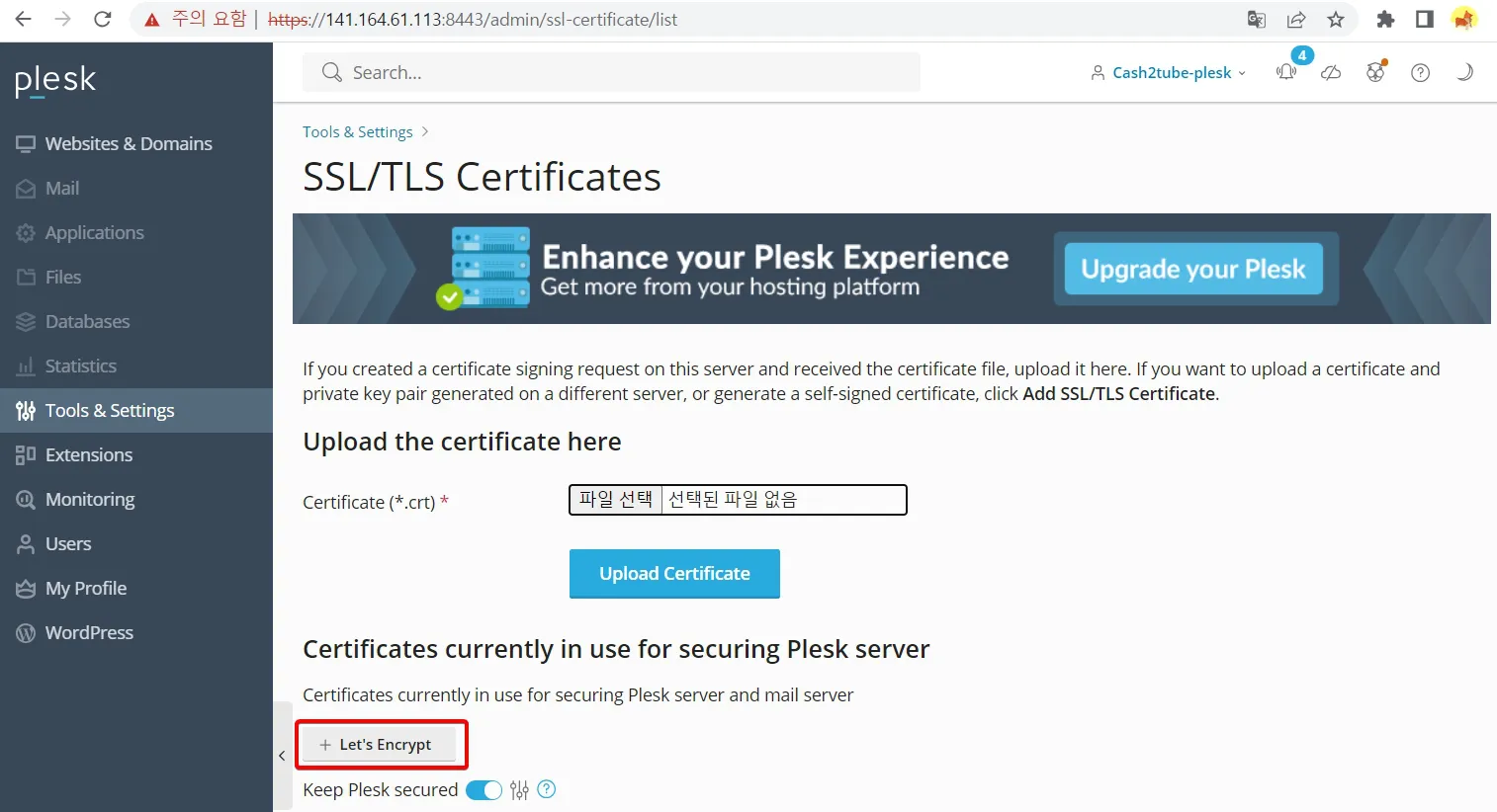 현재 plesk 패널에 접속되어 있는 상태이지만 SSL 인증서가 없는 상태인데, Plesk 패널에 접속할 수 있는 주소로 SSL 인증서를 발급받도록 하겠습니다.