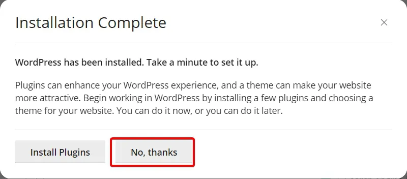 - Installation Complete - No, thanks를 선택, 워드프레스 설치 시 추가적인 번들 테마나 플러그인을 설치할 것 인지 묻는 내용입니다.