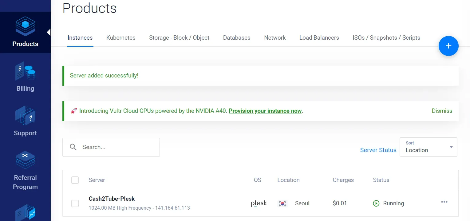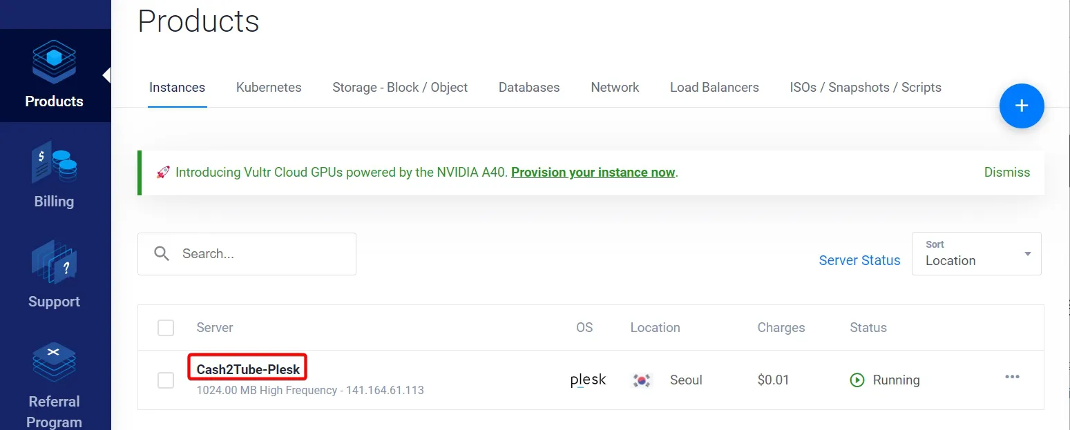 - 벌쳐(vultr)에 만든 서버(Cash2Tube-Plesk) 이름 선택