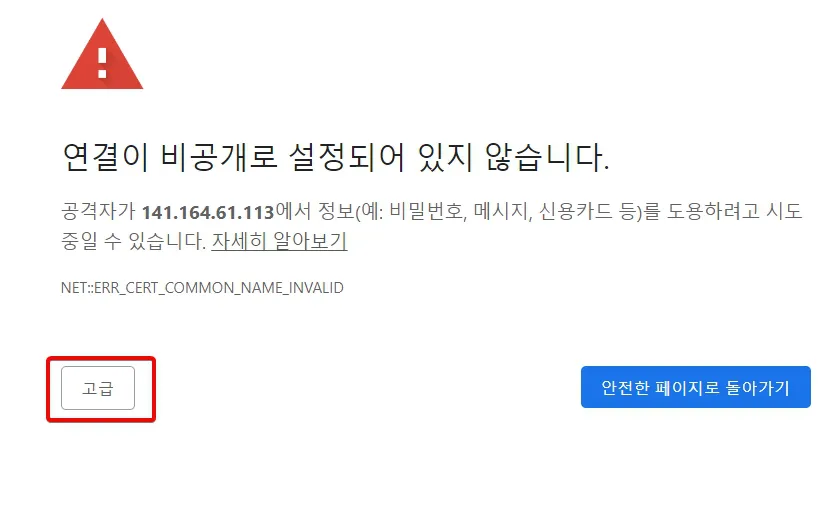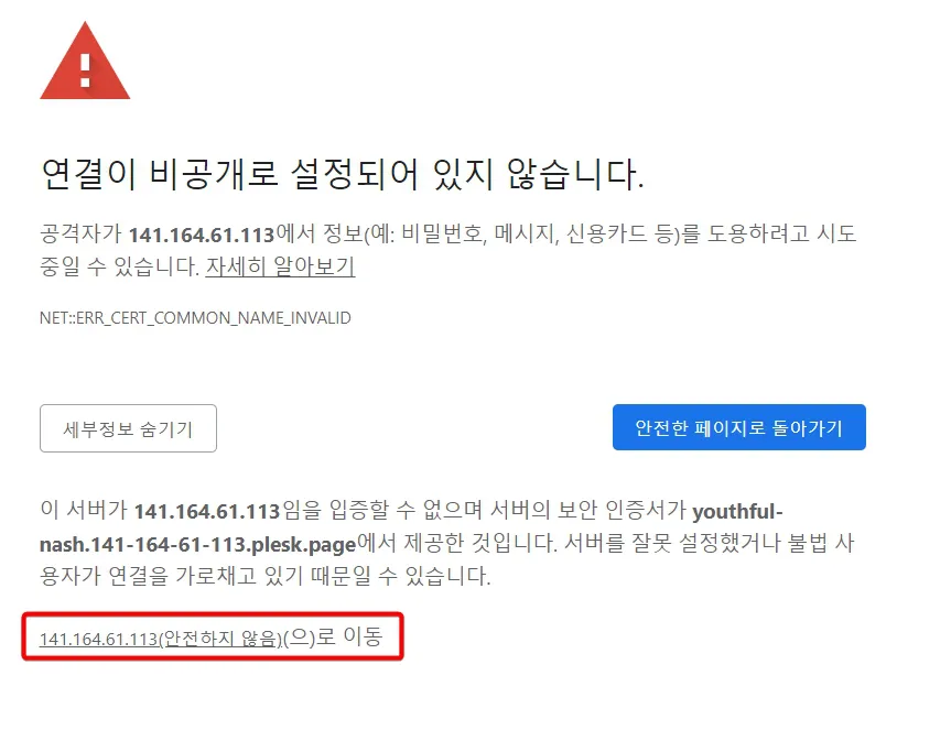 - 빨간색 테두리에 있는 "https://141.164.61.113:8443/login"를 선택해서 plesk 패널에 접속하면 아래의 그림처럼 "연결이 비공개로 설정되어 있지 않습니다"라는 메시지가 나타날 것입니다.