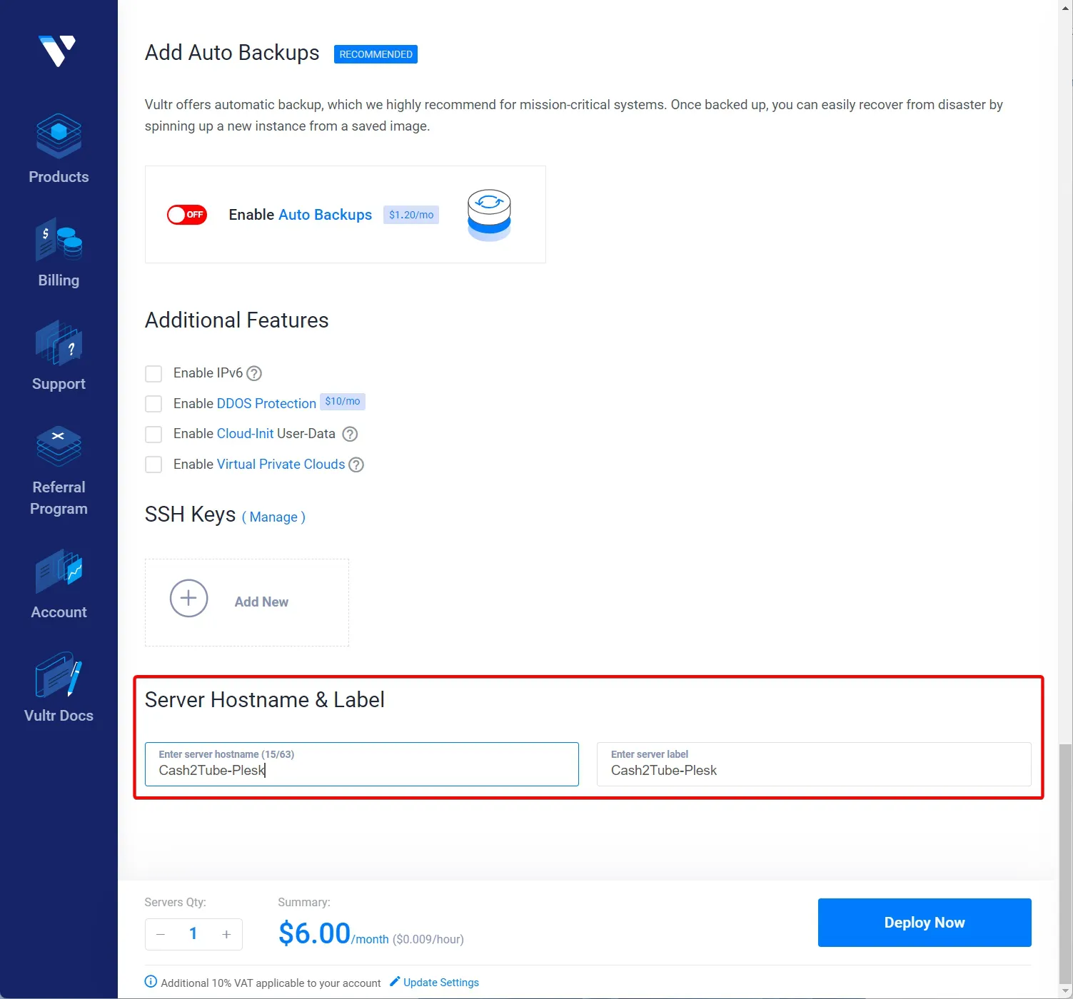 - Server Hostname & Lavel(서버 이름) : 자신이 기억하기 편한 이름으로 작성한 다음 Deploy Now 선택하면 서버 생성을 시작됩니다.