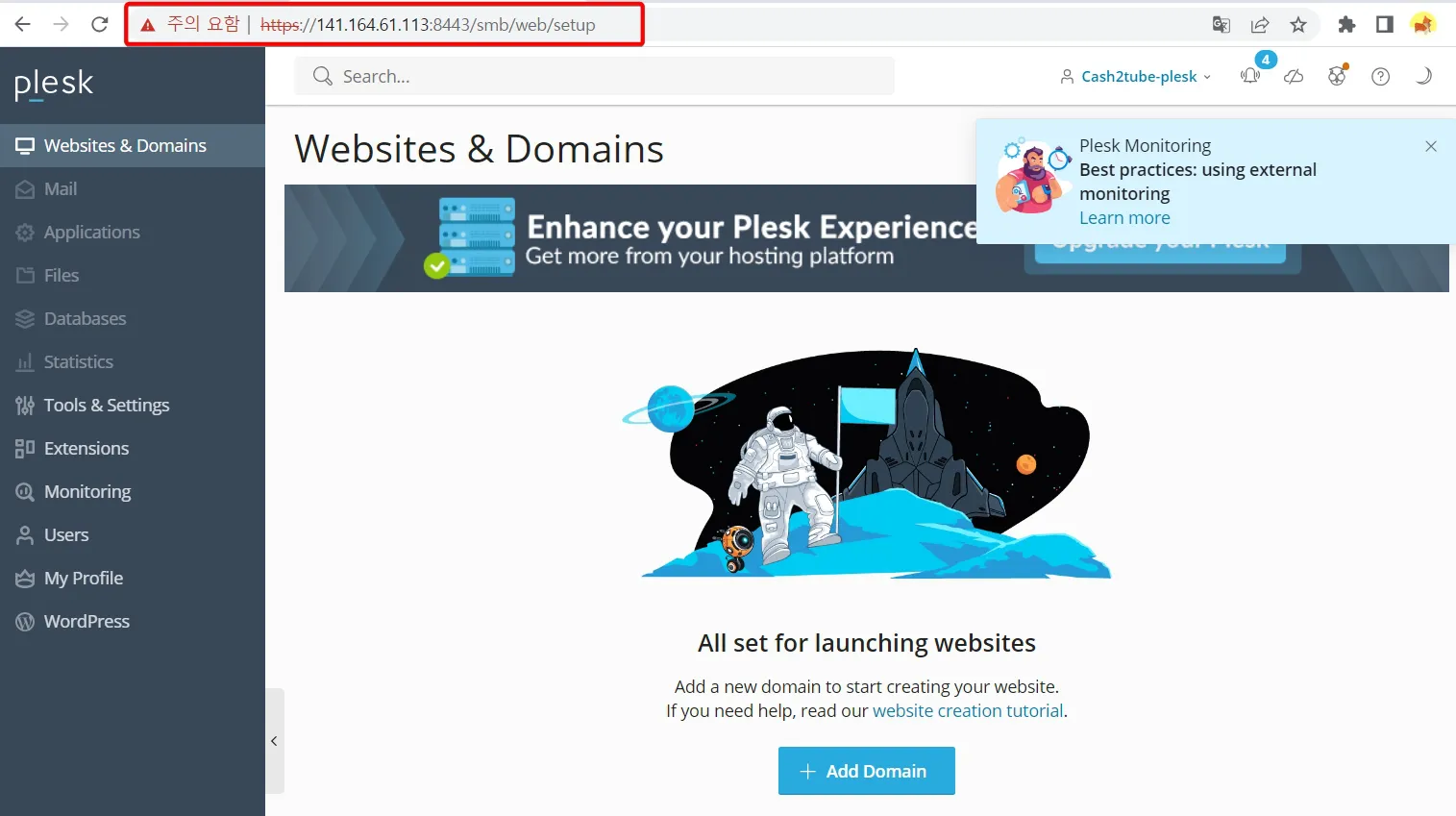 - 마무리 설치가 진행되고 plesk 패널에 접속이 되지만, "https://141.164.61.113:8443" 페이지는 SSL이 없는 페이지입니다.