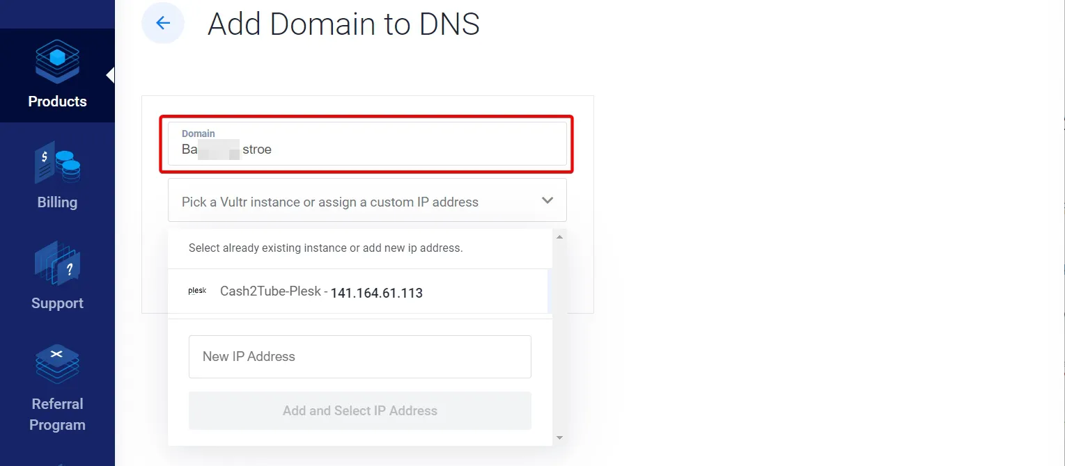 - Add Domain to DNS : 도메인 이름을 입력하고 아래에 있는 Select already existing or add new addres를 누르면 벌쳐에 생성되어 있는 서버리스트가 나옵니다.