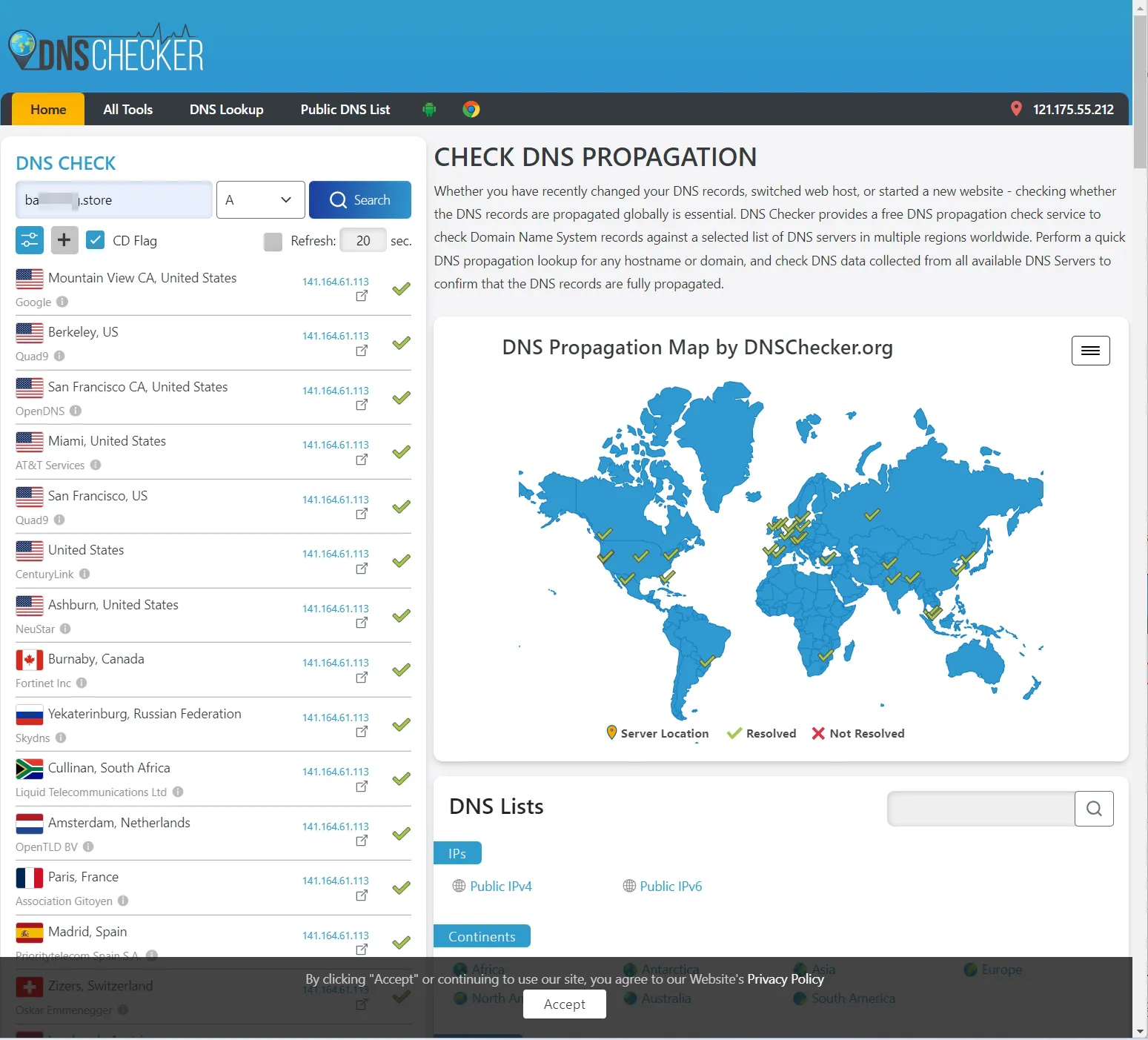 - 서버 ip 주소와 연결된 도메인이 제대로 전파되고 있는지 https://dnschecker.org/ 또는 https://www.whatsmydns.net/ 에서 도메인을 입력하고 확인해 보세요.