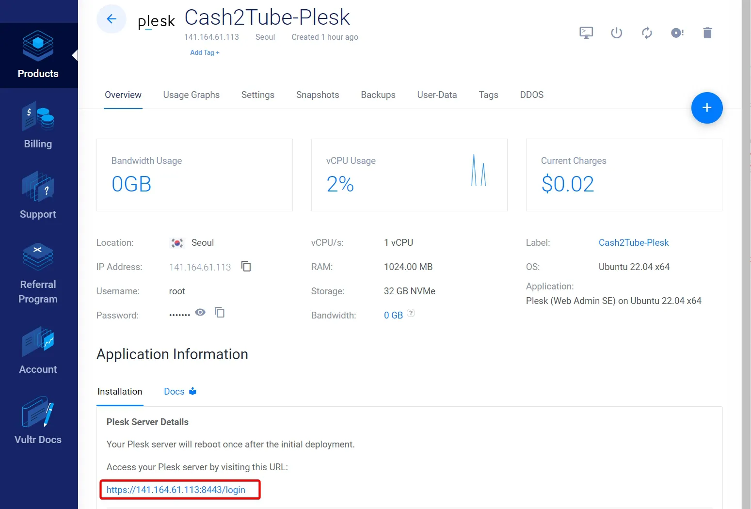 벌쳐(vultr)에 만든 클라우드 컴퓨터(서버)의 이름을 눌러서 서버의 로그인 정보(root, 패스워드)를 확인하고 plesk 패널에 접속하면서 관리자(admin) 계정을 생성하는 과정을 진행할 것입니다.