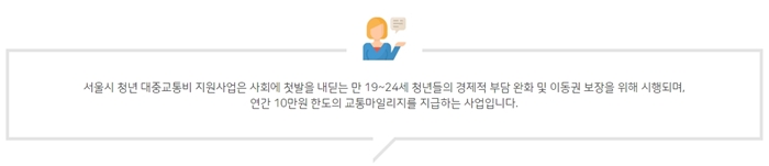 청년몽땅정보통에 공개된 자료를 살펴보면 "서울시 청년 대중교통비 지원사업은 사회에 첫발을 내딛는 만 19~24세 청년들의 경제적 부담 완화 및 이동권 보장을 위해 시행되며, 연간 10만 원 한도의 교통마일리지를 지급하는 사업입니다."이라고 되어 있습니다. 사회초년생에게는 도움이 되는 정책으로 생각됩니다.