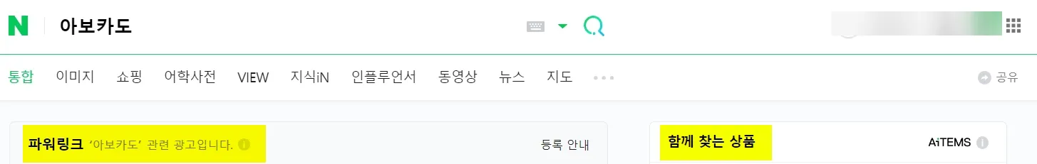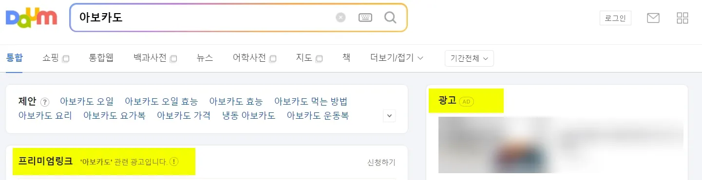 네이버, 다음에서 검색결과 #1 - 검색어 "아보카도" = 광고성 키워드