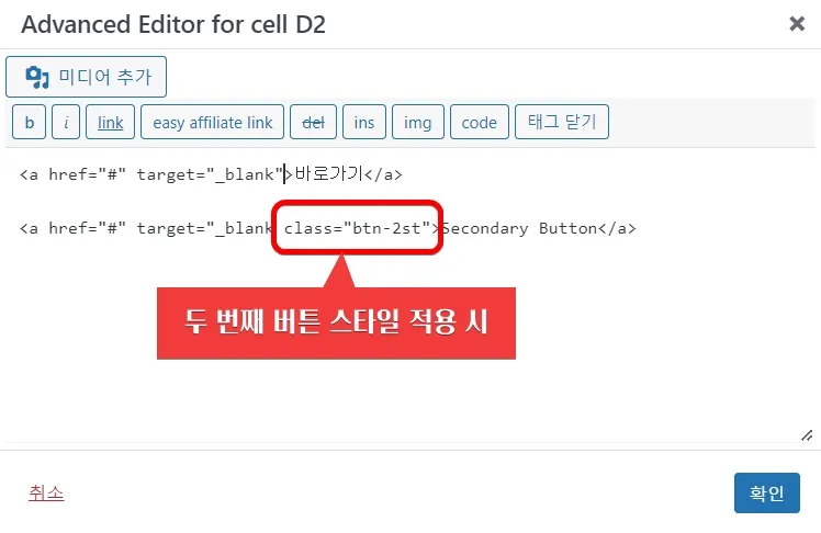 TablePress 표에 링크를 삽입하면 기본적으로 버튼 스타일이 적용됩니다. 두 번째 버튼 스타일은 a태그 내부에 class="btn-2st" 추가로 작성해 줘야 정상적으로 적용이 됩니다.