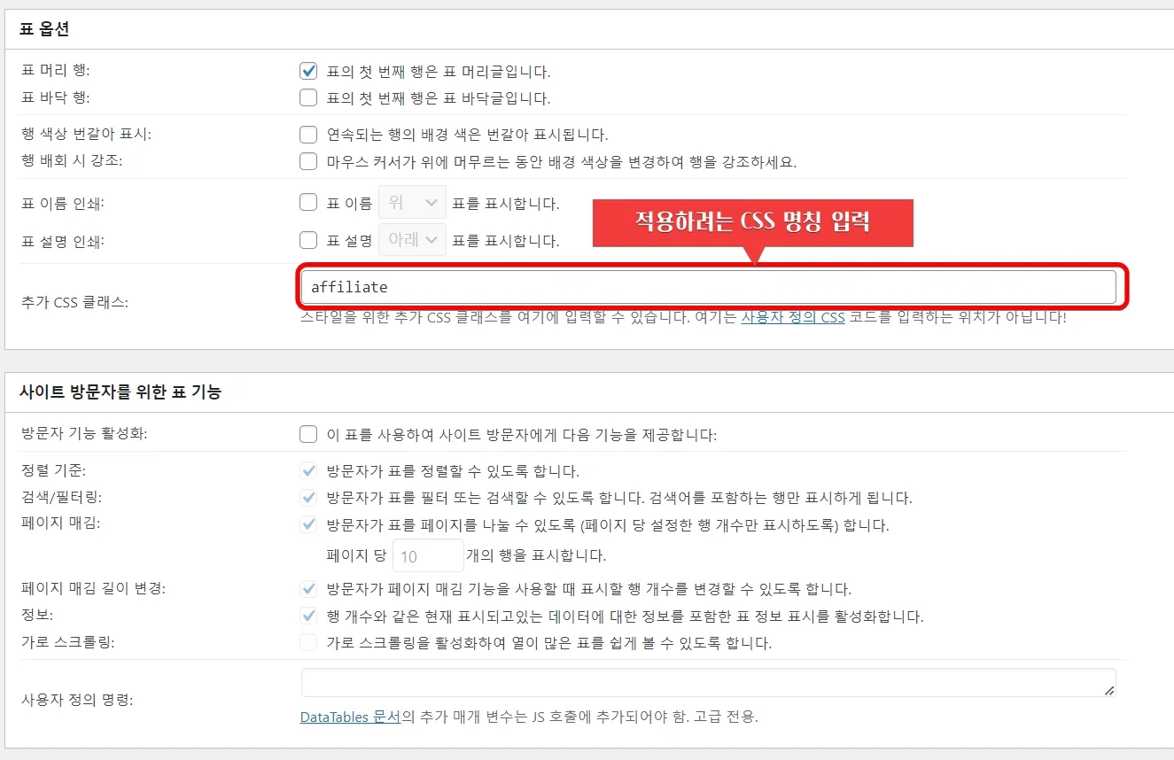그런 다음 '모든 표' 탭에서 표를 작성하거나, 기존의 표에 적용하려는 디자인의 CSS 명칭을 입력해 주면 됩니다.