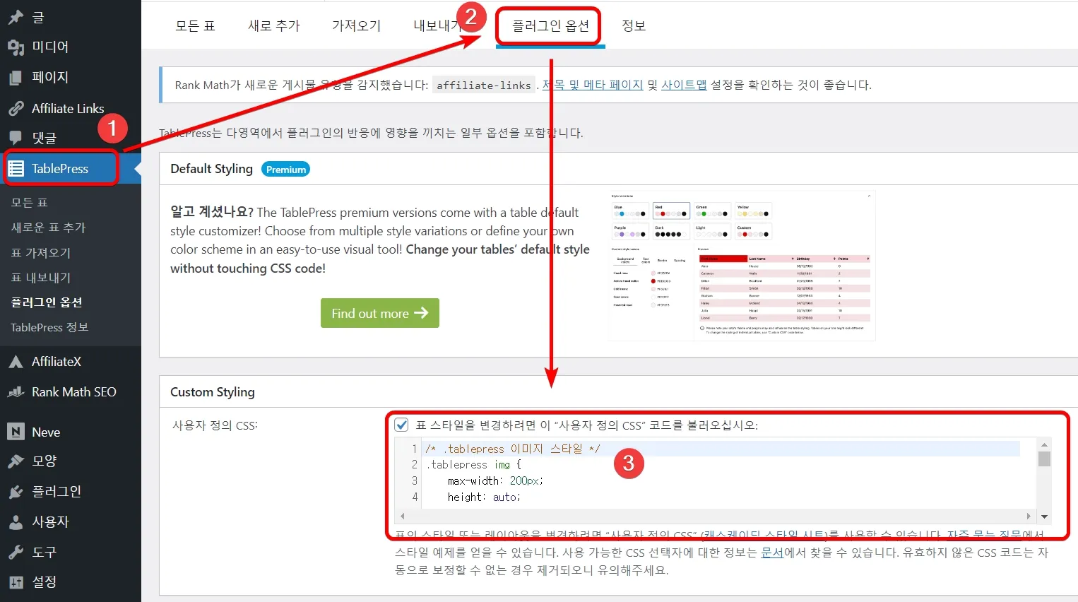 TablePress 반응형 CSS 코드를 사용하는 방법은 간단합니다. 다운로드한 CSS 코드를 아래의 그림처럼 'TablePress - 플러그인 옵션' 탭을 붙여 넣기 한 다음 저장해 주세요.