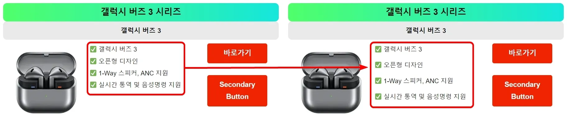 - 제품 비교 디자인 : 2 ~ 4개의 제품을 비교할 수 있도록 디자인되어 있으며, 모바일에서 동일한 모습으로 보입니다.