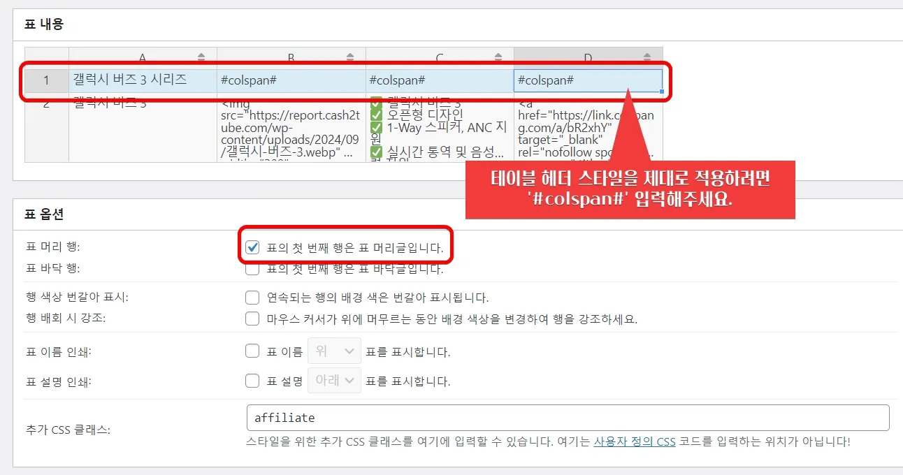 테이블 헤더 스타일을 제대로 적용하려면 표의 첫 번째 행을 아래의 그림처럼 작성해 주세요. 'A1' 셀에 내용을 입력하고 나머지 B1, C1, D1에는 '#colspan#'을 입력해 주세요.