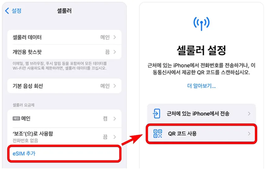 설정 - 셀룰러 - eSIM 추가 - QR 코드 사용해서 심(SIM) 정보를 다운받고, 데이터, 전화, 문자를 어떤 회선을 기본으로 이용할 것인지 설정하면 됩니다.