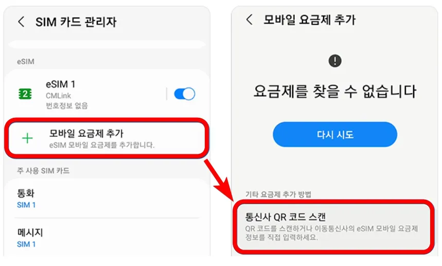 설정 - 연결 - SIM카드 관리자 - 모바일 요금제 추가 - 통신사 QR 코드 스캔 메뉴를 이용해서, SIM 정보를 다운로드 받아서, 기본적으로 데이터, 전화, 문자를 어떤 회선을 사용할 것 인지 설정하면 됩니다.