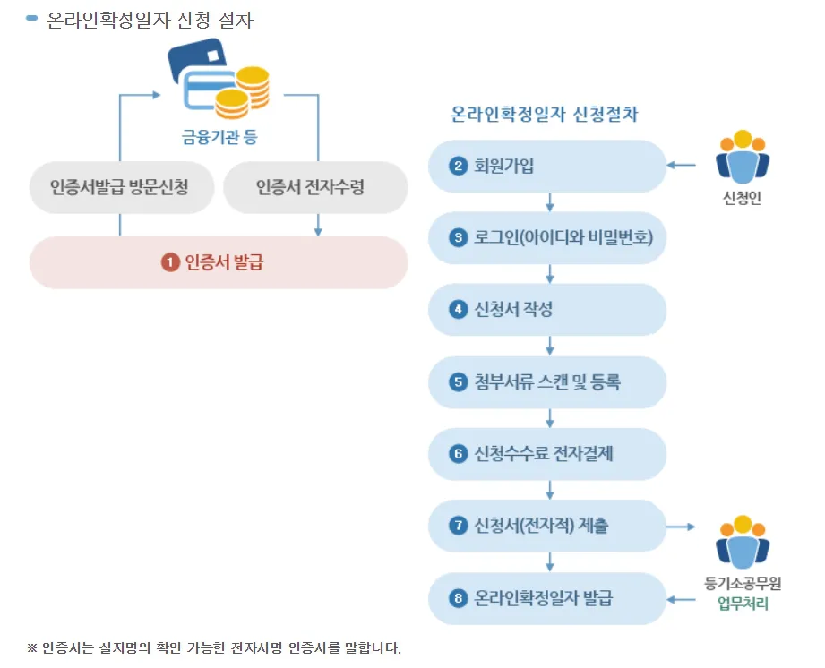 확정일자는 "인터넷 등기소" 홈페이지에서 온라인으로 신청할 수 있어요. 모바일 앱으로 신청하려고 할 때에는 "스마트 하우스" 앱을 사용해서 신청할 수 있어요.