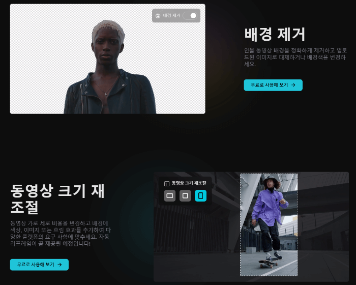 배경 제거 및 동영상의 크기 재조절이 가능합니다. 다양한 형태로 재 편집을 통해서 쇼츠 같은 영상도 쉽게 제작할 수 있습니다.