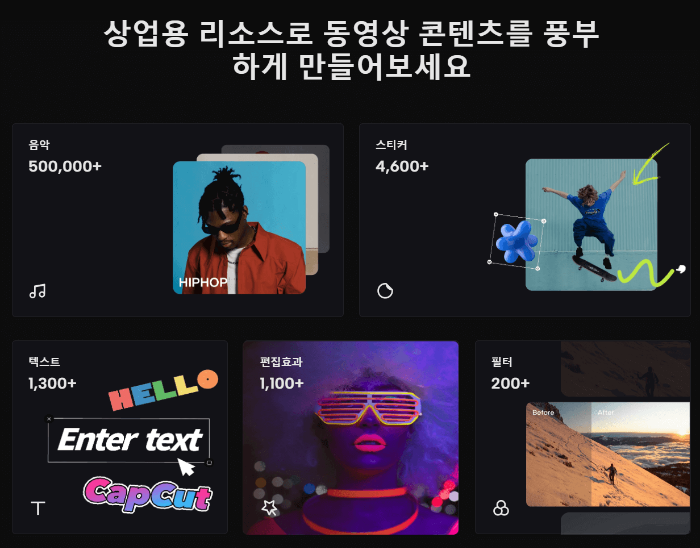음악, 스티커, 텍스트, 편집효과, 필터 등 상업용 리소스를 제공하고 있습니다. 다양한 리소스를 통해서 영상을 보다 효과적으로 만들 수 있습니다.