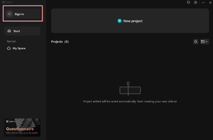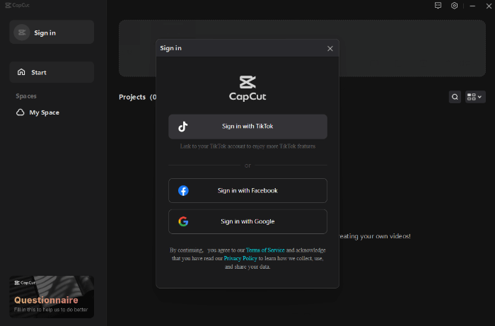 캡컷이 실행되면 Sign In를 눌러서 회원가입을 하시면 됩니다. 회원 가입은 자신이 편한 방식으로 하시면 됩니다.