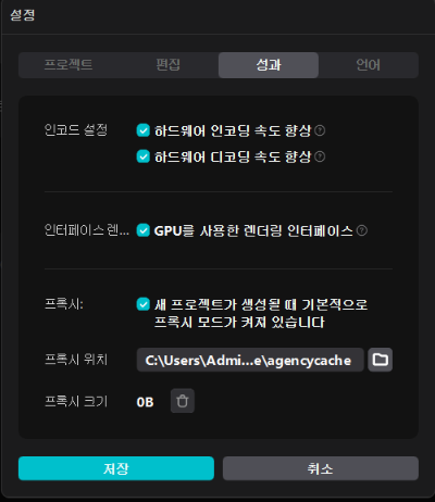 설정 - 성과 탭에서 프록시를 사용하는 것으로 체크합니다. 프록시 사용은 고화질 영상 편집 시 반드시 필요합니다.