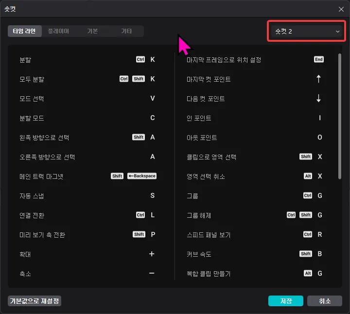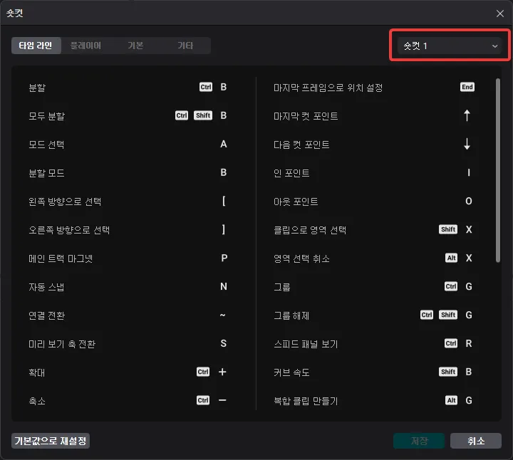 타임라인에서 컷 편집 시 자주 사용하는 단축키를 사용자에게 맞도록 변경해서 사용하는 것만으로도 편집의 효율을 올릴 수 있습니다.