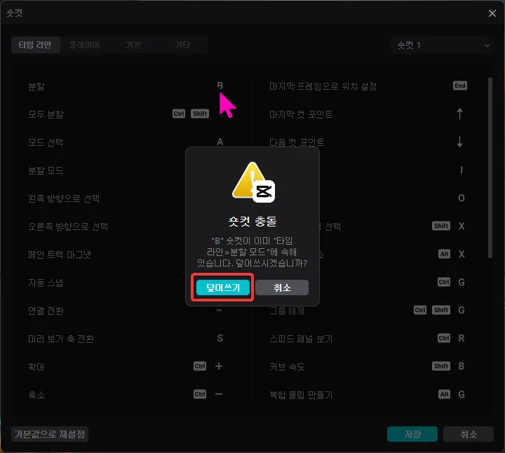 단축키가 충돌이 되었다는 메시지가 나오면 [덮어쓰기]하고 저장을 하면 단축키 변경이 완료됩니다.