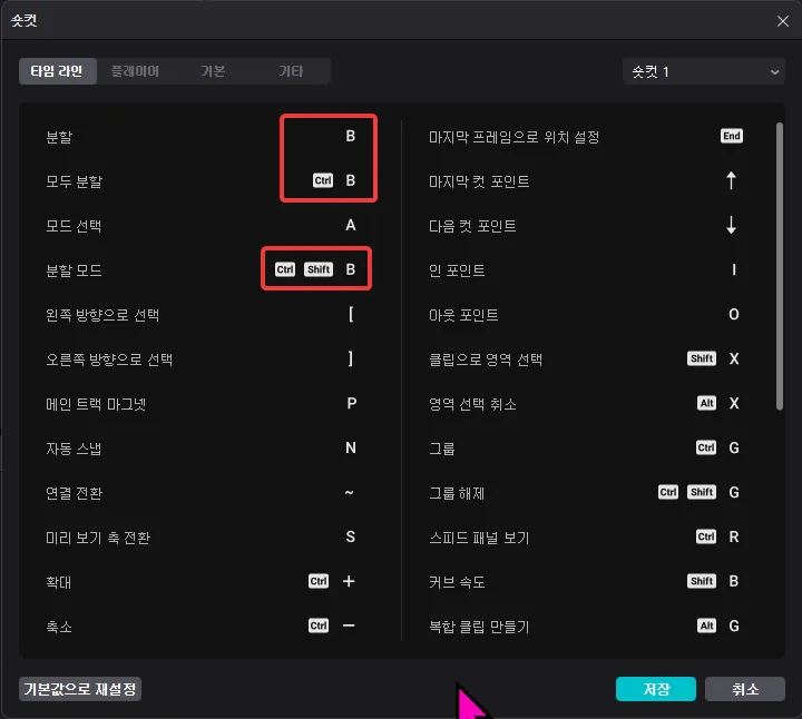 타임라인에 있는 클립을 자를 때 자주 사용하는 기본 명령의 단축키는 [컨트롤 + B]입니다. 이것으로 [B]로 변경하는 것만으로도 편집 효율이 올라갈 수 있습니다.