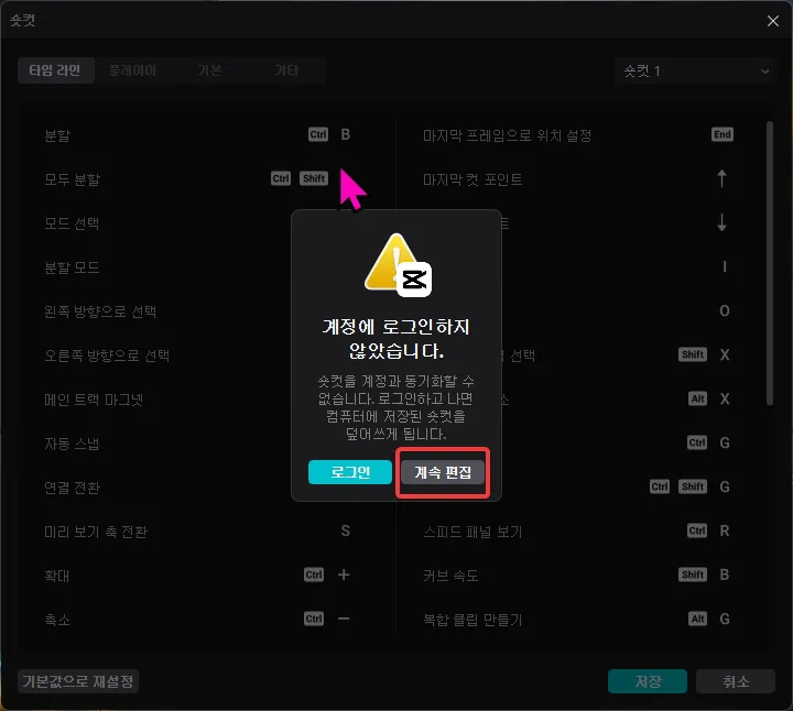 변경하려고 하는 단축키가 있는 곳을 선택하면 로그인하라고 나오는데, 그냥 [계속 편집]을 선택하고 새로운 단축키를 입력하면 됩니다.