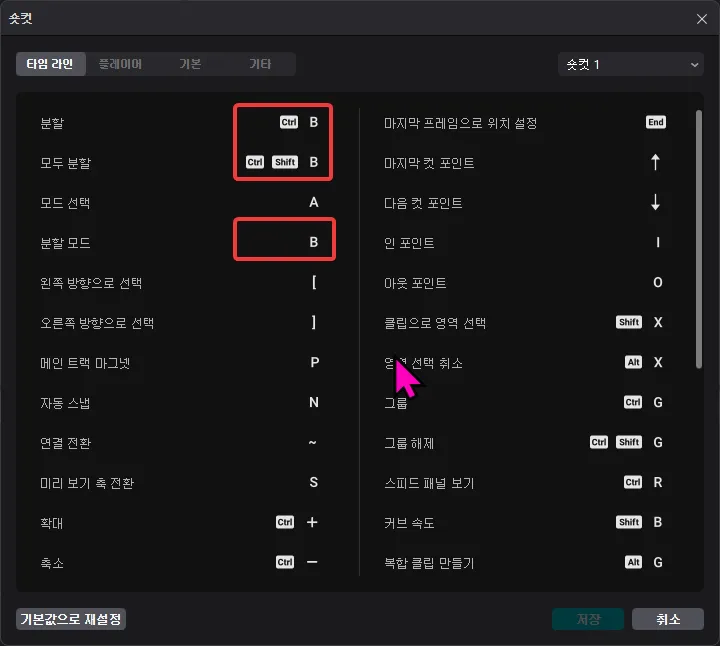 변경 전에는 [컨트롤 + B]로 자르던 것을 B로 자르고, [컨트롤 + 쉬프트 + B]로 자르던 것을 [컨트롤 + B]로 자르도록 변경하였으며 확인해 보면 제대로 동작하고 있습니다.