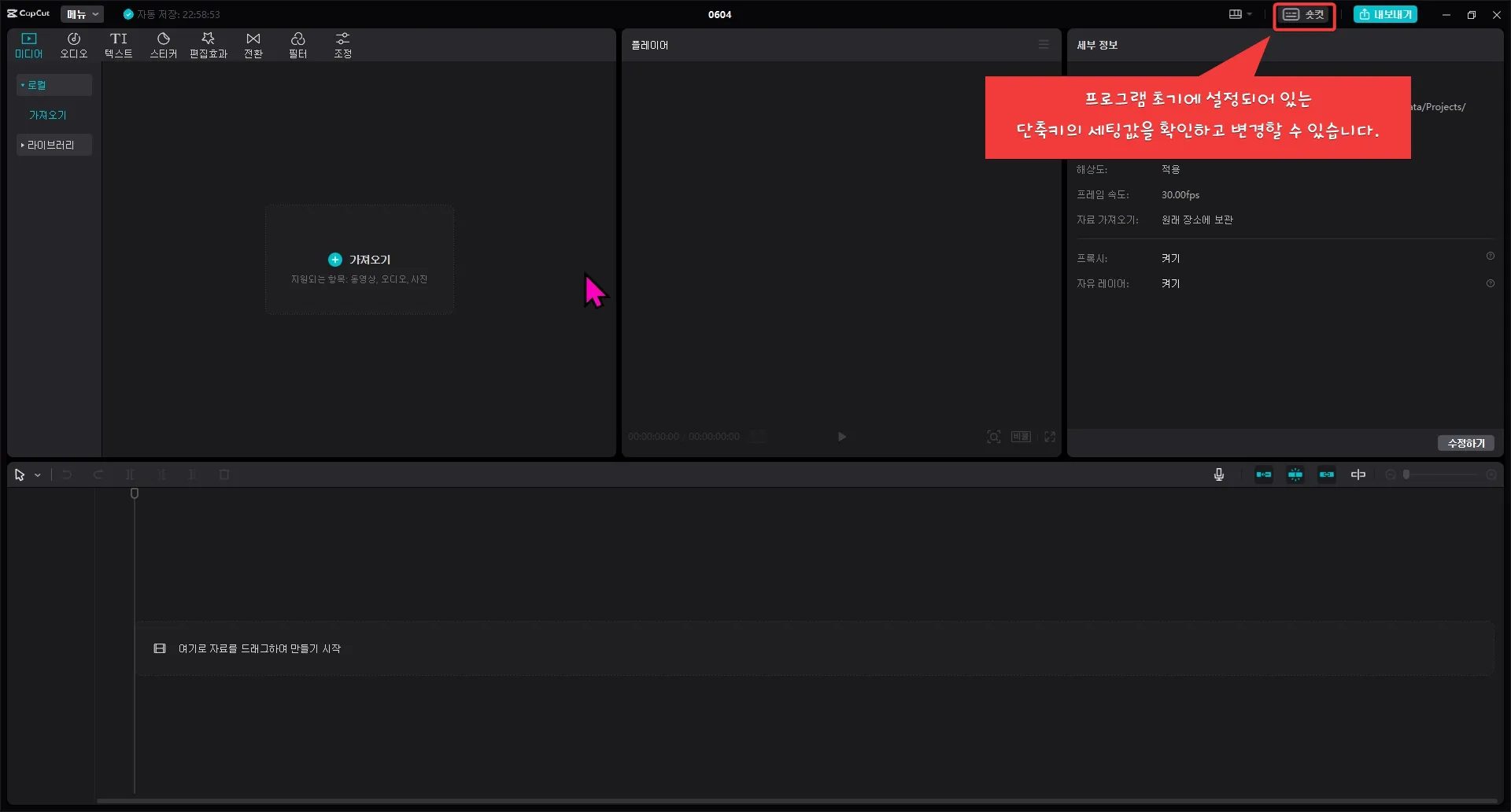 프로그램 우측 상단에 있는 [숏컷]이라는 메뉴를 눌러보면 캡컷(capcut) 프로그램 초기 세팅값을 확인할 수 있으며 단축키를 변경할 수 있습니다.