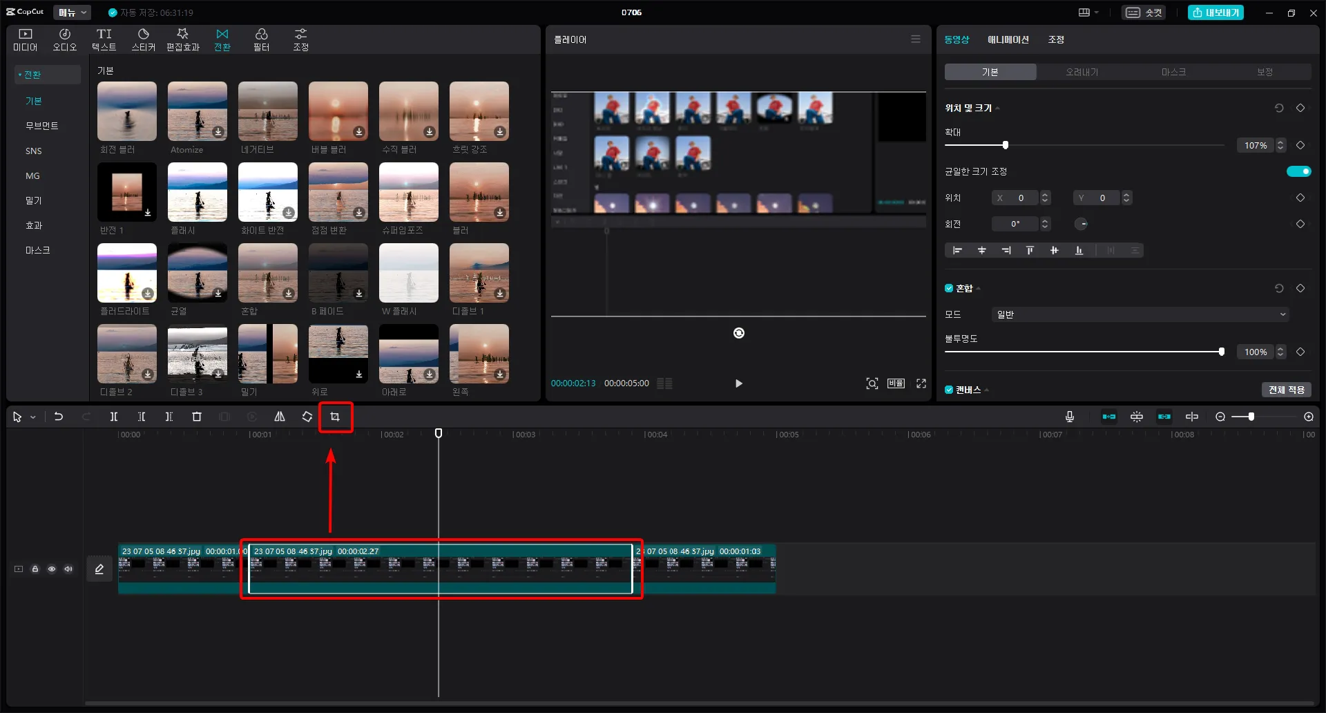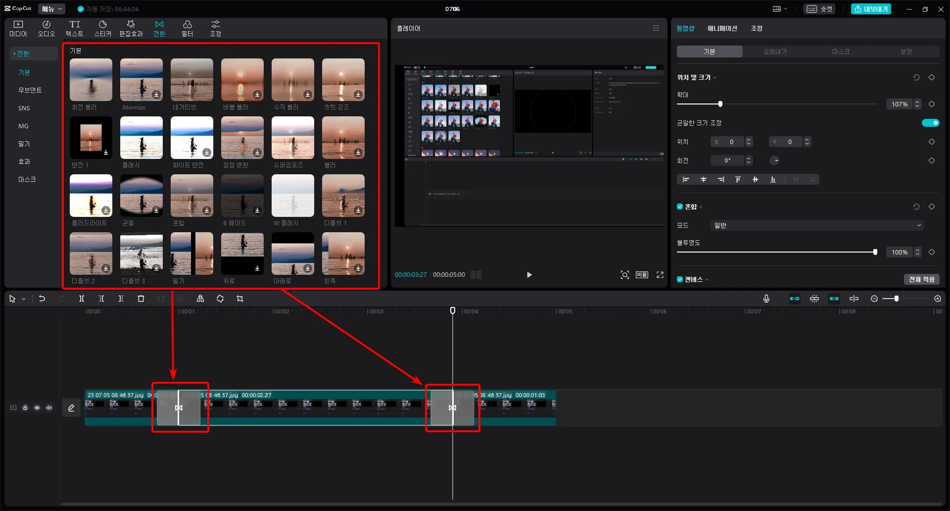 - 일반 배율의 클립과 확대된 부분의 클립 사이에 전환효과를 추가하거나,
