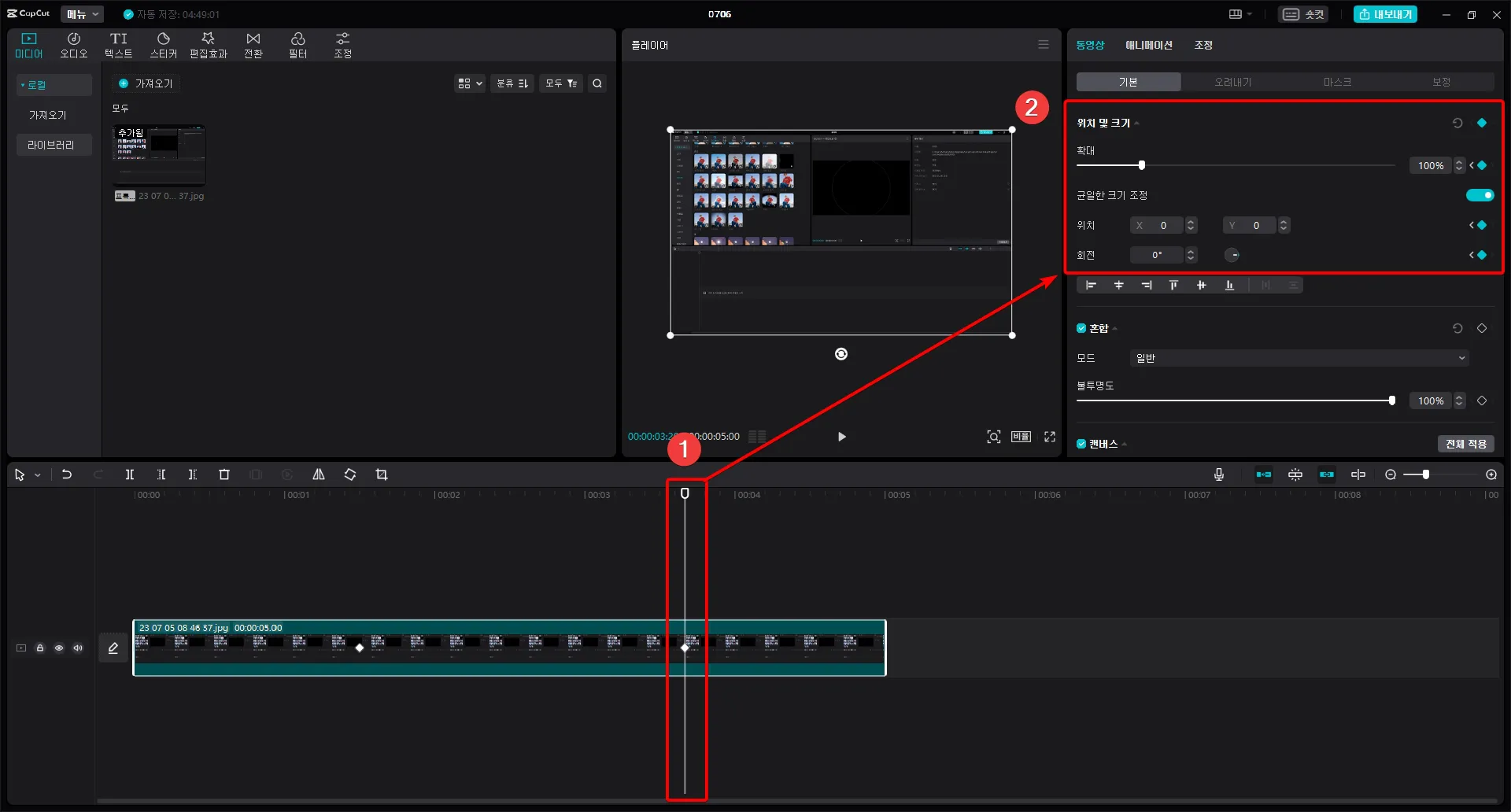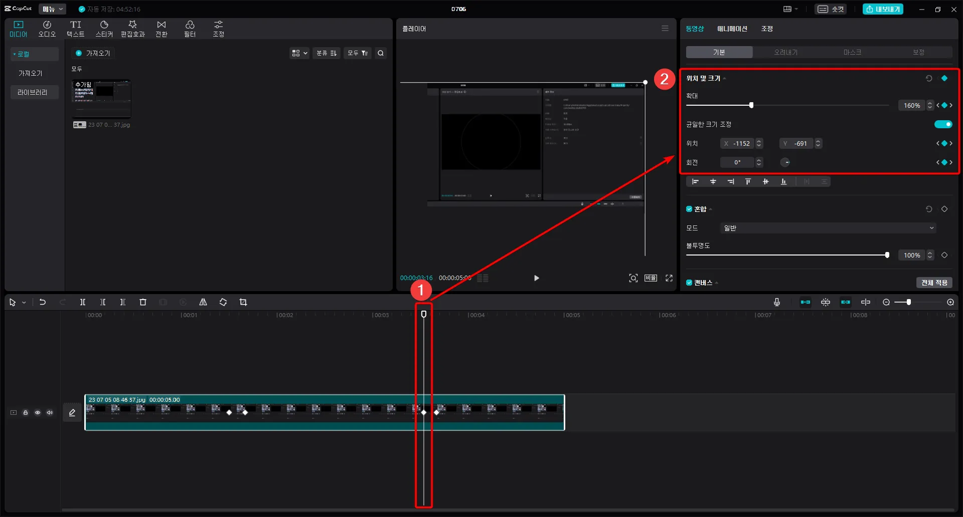 [기본] - [위치 및 크기]에서 확대하는 방법을 사용해서 특정 부분을 확대해서 보여 줄 수 있습니다. 자연스러운 영상 흐름을 위해서는 키 프레임을 활용해서 잠시 확대하는 것이 좋습니다.