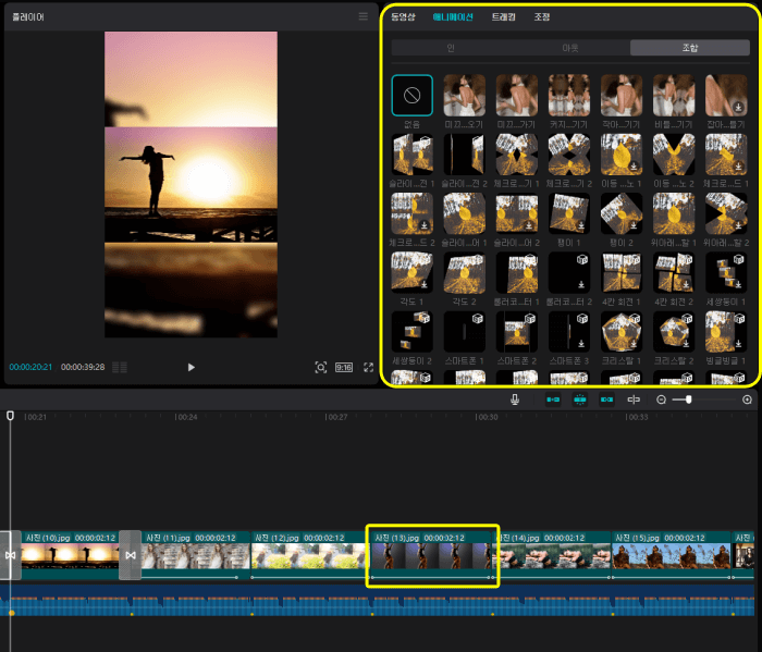 조합은 영상의 시작 중간 끝 부분에 모두 적용되는 효과입니다.