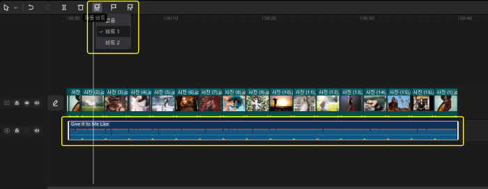 타임라인에 있는 오디오 클립을 선택하면 타임라인 편집창 좌측 상단에 오디오 비트를 추가 / 삭제할 수 있는 메뉴가 활성화됩니다. 자동 비트 1을 추가하였습니다.