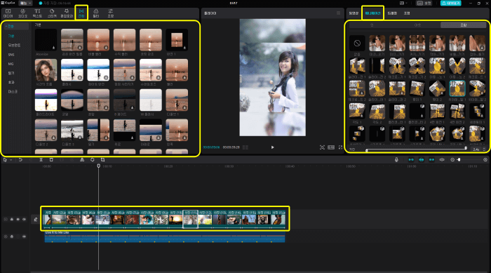 캡컷(capcut)에는 프로그램 좌측 상단에 [전환] 효과와 타임라인에서 동영상 및 사진 클립 선택 시 사용할 수 있는 애니메이션 효과가 있습니다.
