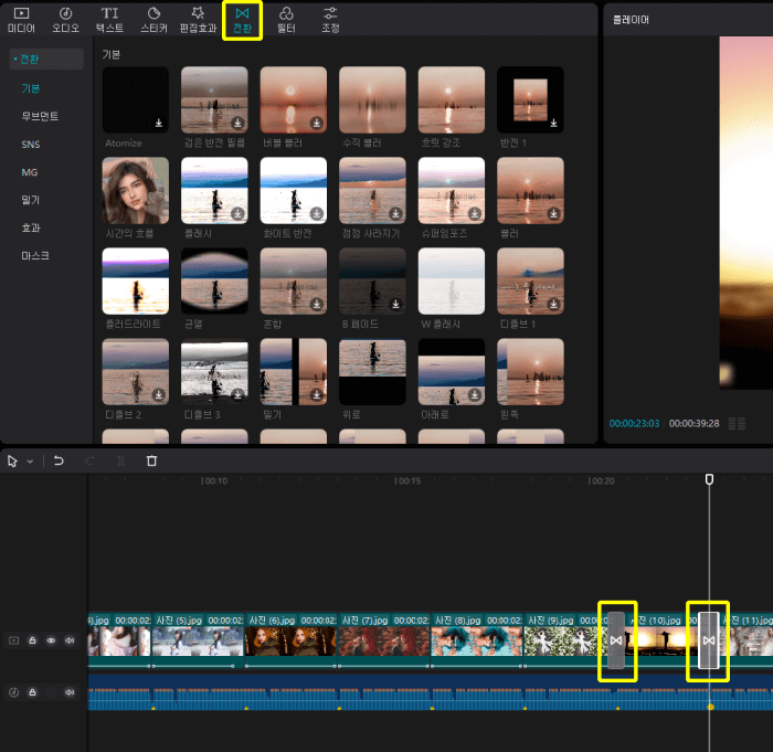 전환 효과를 추가하면 아래의 그림처럼 타임라인에 있는 사진 클립 사이에 전환 효과 마크가 생성됩니다.