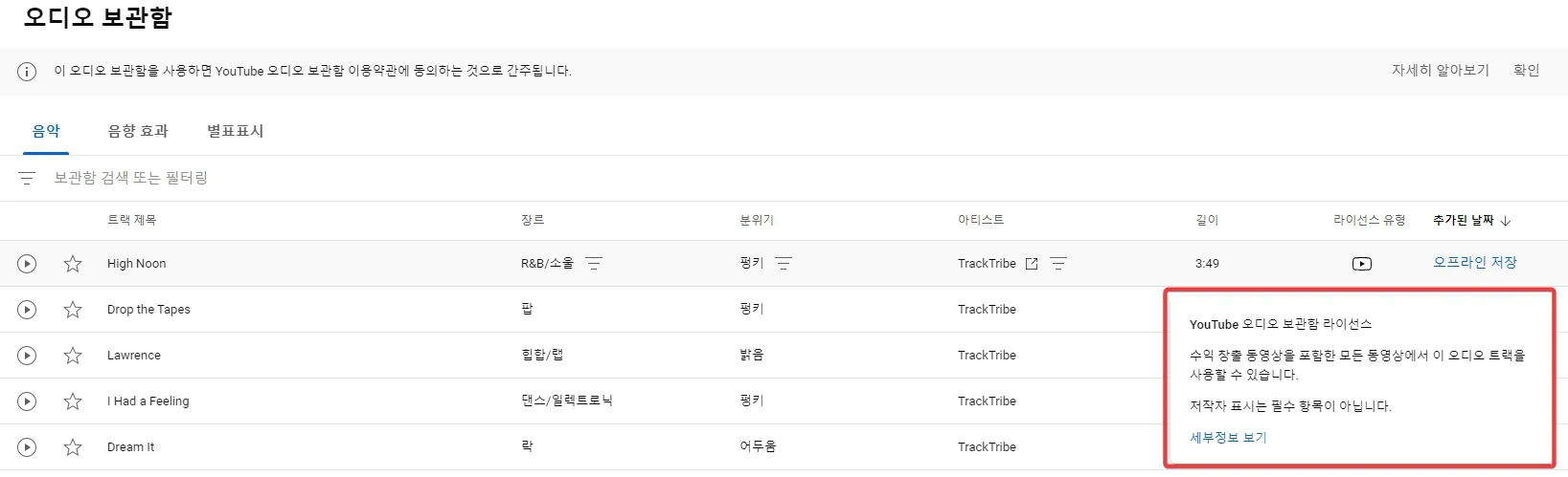 유튜브 영상 제작에 필요한 무료 음원은 유튜브 스튜디오 - 오디오 보관함에 있는 음원을 사용하시길 추천드립니다. 하지만 해당 음원이 포함된 영상을 다른 플랫폼에 올리는 것은 절대 하면 안 됩니다.