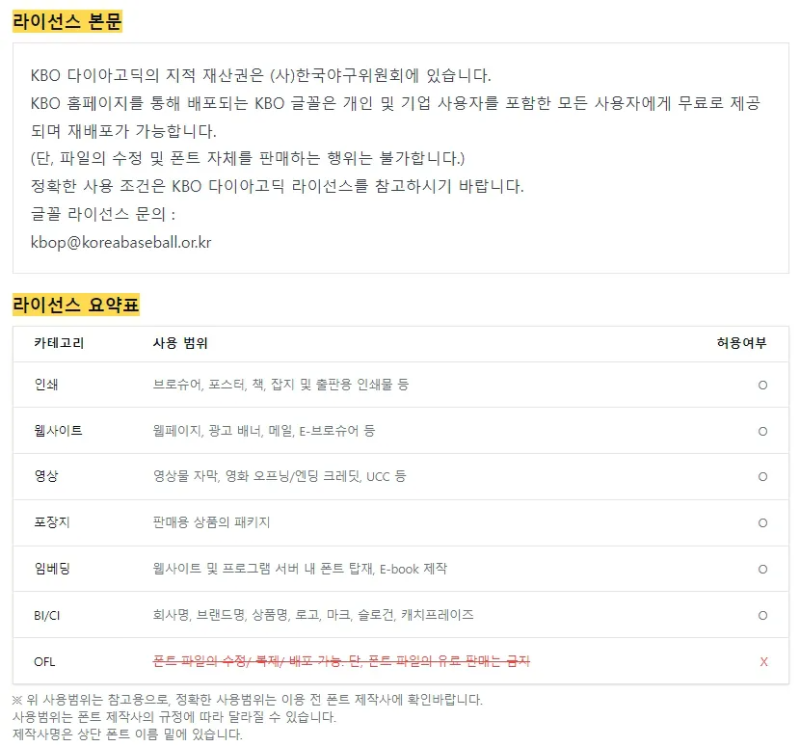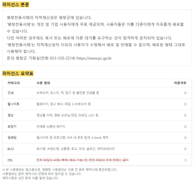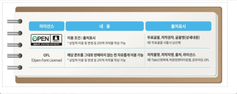 무료로 배포되는 글꼴을 사용할 경우 저작권자의 홈페이지에서 세부적인 사용범위 및 조건을 반드시 확인하고, 저작물명(폰트명), 저작권자, 출처, 라이선스를 표기해야 합니다. OFL(Open Font License)의 경우에도 동일합니다.