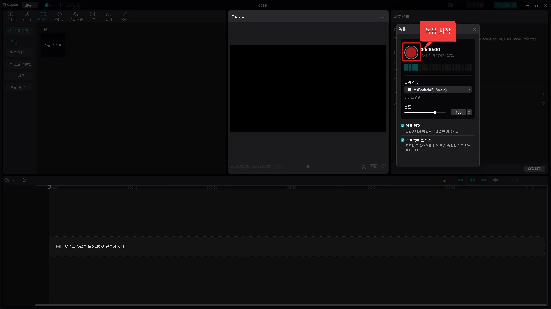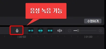 타임라인 작업창 우측 상단에 마이크 모양의 아이콘이 있습니다. 이 버튼이 영상에 음성을 녹음하여 추가할 수 있는 기능입니다.