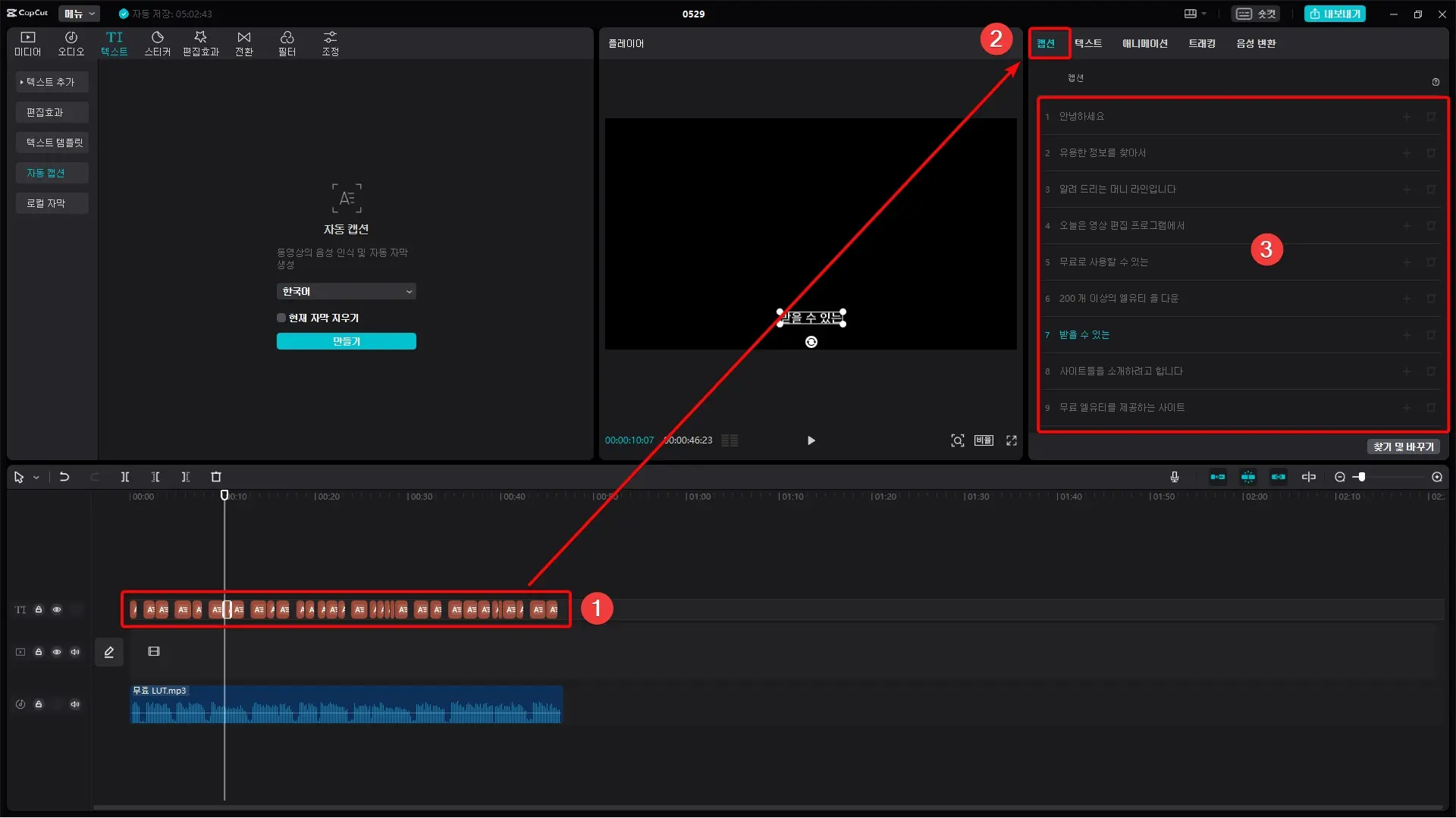 자동 캡션 기능을 활용하여 자동으로 자막이 생성되었다면 자막에 대한 검사를 하고 수정해야 합니다. 이러한 수정 작업도 크게 어렵지 않습니다.
