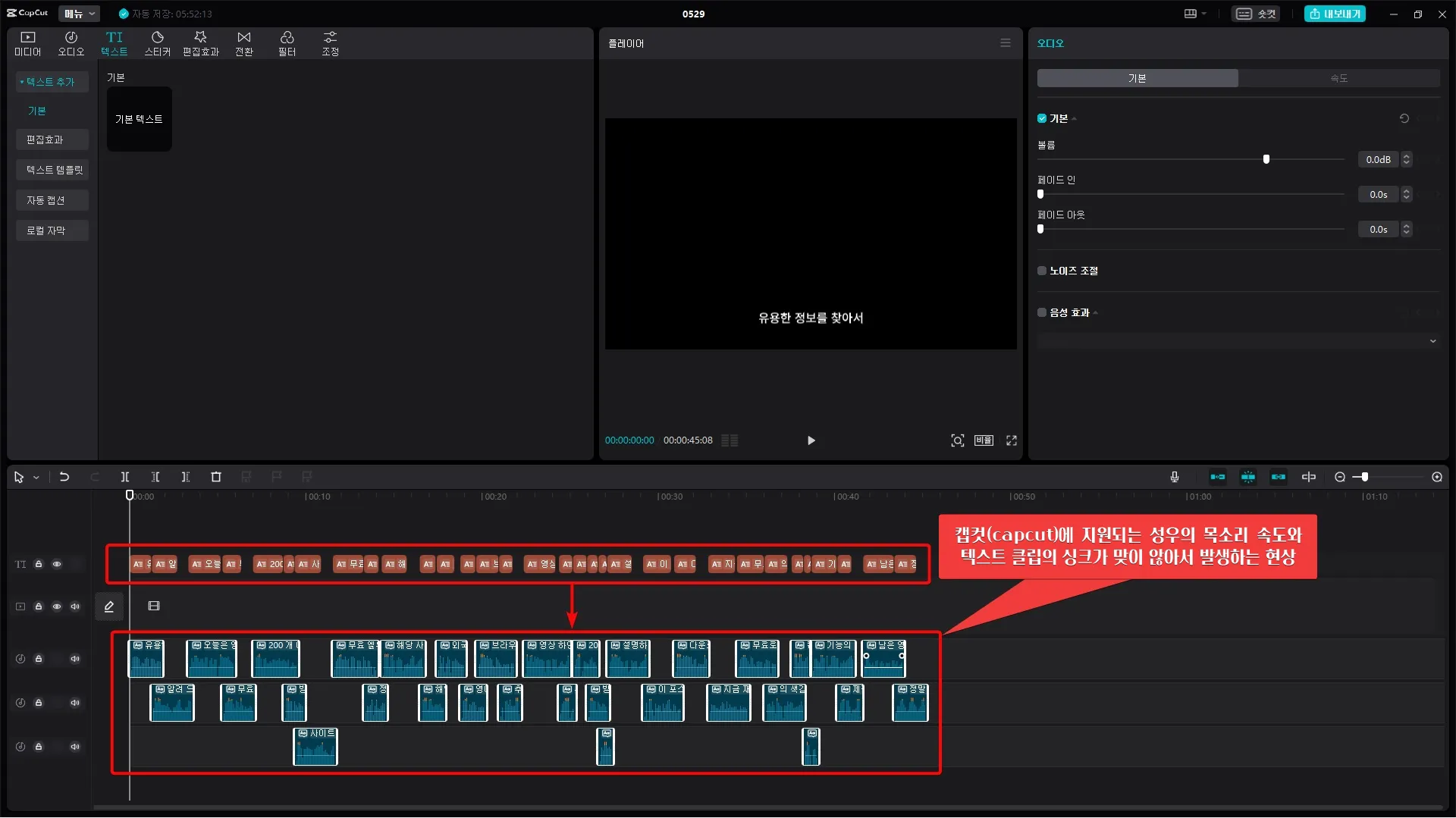 하지만, 이런 경우 아래와 같은 현상이 생길 수 있습니다. 원인은 캡컷(capcut)에서 지원하는 성우의 목소리 속도와 텍스트 클립의 싱크가 맞지 않아서 발생합니다.