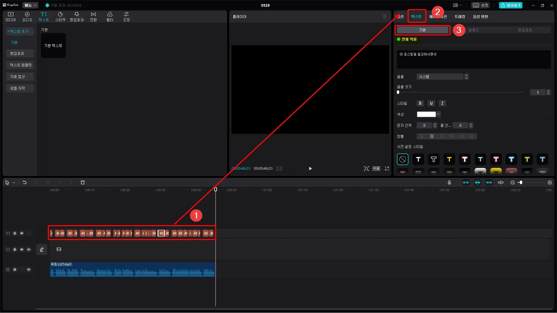 자막의 글꼴, 크기, 자막의 배경 등의 자막 스타일을 수정하기 위해서는 타임라인의 자막 클립을 선택하고 프로그램 우측 상단에 있는 [텍스트] - [기본]에 있는 메뉴 항목을 활용하여 수정할 수 있습니다.