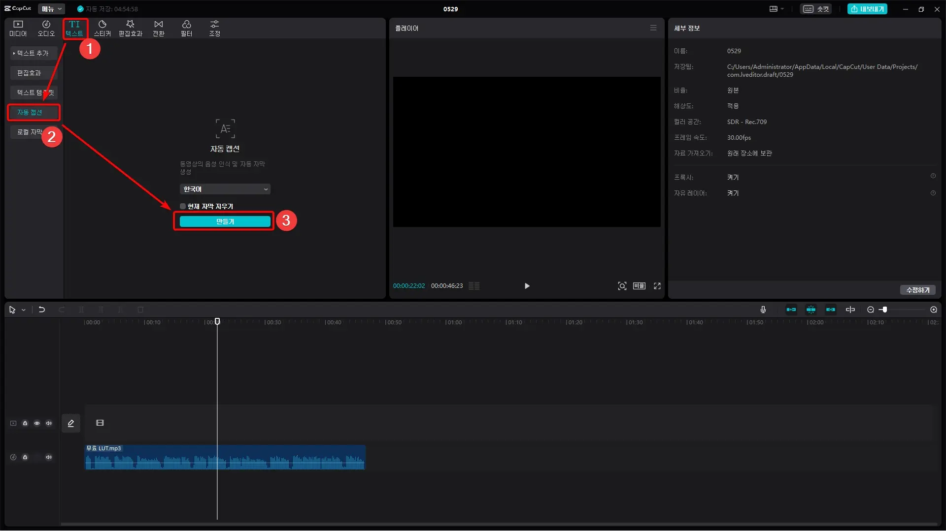 자동 캡션(자동 자막) 기능은 프로그램 좌측 상단에 있는 [텍스트] - [자동 캡션]을 선택하면 사용할 수 있습니다.