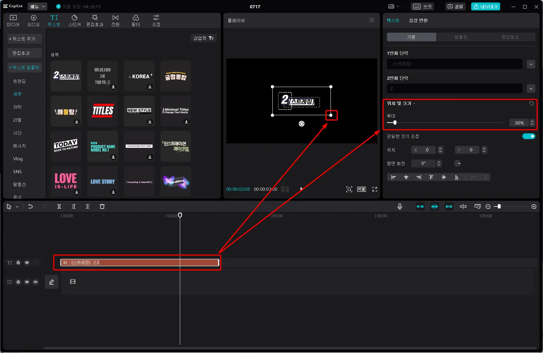 타임라인에 추가된 텍스트 템플릿을 선택하면 프로그램 우측 상단에 활성화되는 메뉴에서 [위치 및 크기]에서 텍스트 템플릿의 크기를 조절하거나, 미리보기 창에 있는 텍스트 템플릿의 모서리를 드래그하시면 크기를 조절할 수 있습니다.