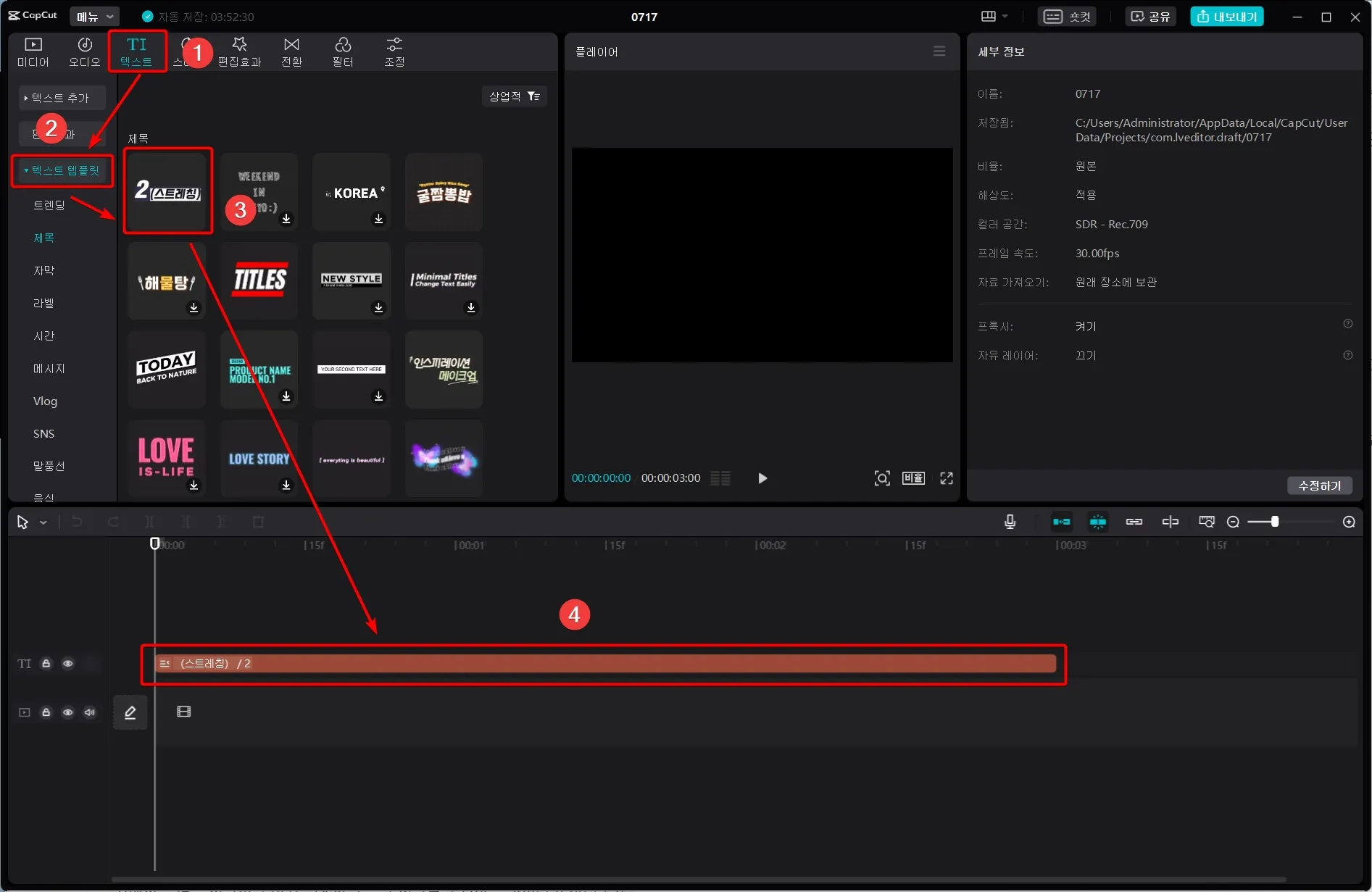 캡컷(CapCut) 프로그램 좌측 상단에 있는 메뉴 중에서 [텍스트] - [텍스트 템플릿]에는 잘 만들어진 다양한 텍스트 템플릿들이 있으며 사용하고 싶은 것을 골라서 타임라인에 추가하면 됩니다.